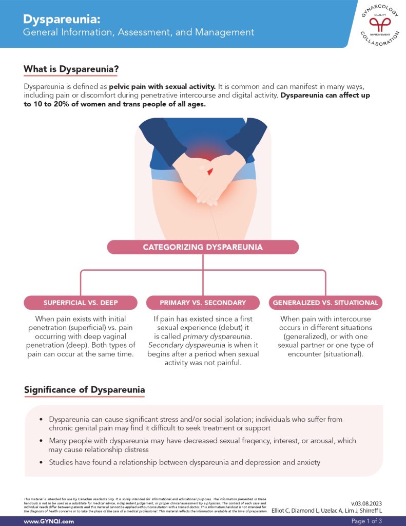 - Dyspareunia is characterized by pelvic pain during sexual activity, affecting up to 20% of women and trans individuals across all age groups, manifesting as discomfort during penetrative intercourse or digital stimulation.