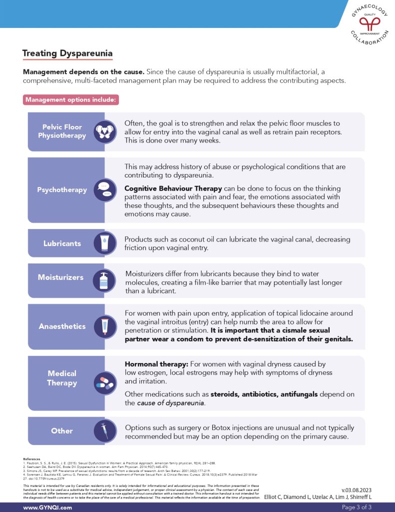 Treatment options and management of dyspareunia vary based on the cause, and since dyspareunia is often multifactorial, a comprehensive and multi-faceted approach may be necessary.