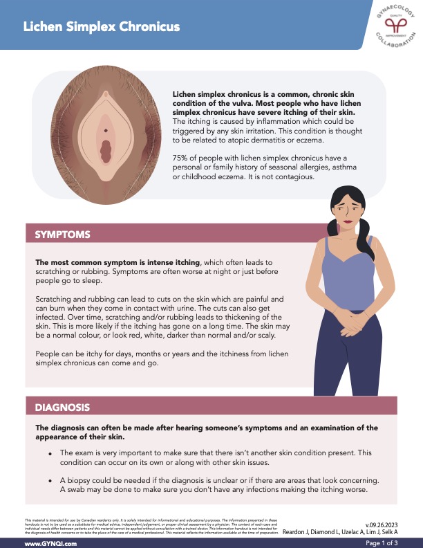 • Lichen Simplex Chronicus is a persistent vulvar skin condition characterized by severe itching due to inflammation. It’s often linked to atopic dermatitis or eczema, and commonly affects those with a history of allergies or asthma.
