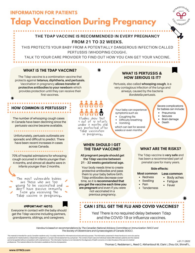 • In Canada, doctors recommend that all pregnant women get the Tdap vaccine at around 21-32 weeks gestation. This is slightly earlier than the CDC’s standard recommendation of 27-36 weeks.
